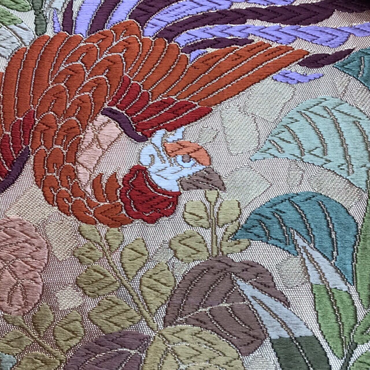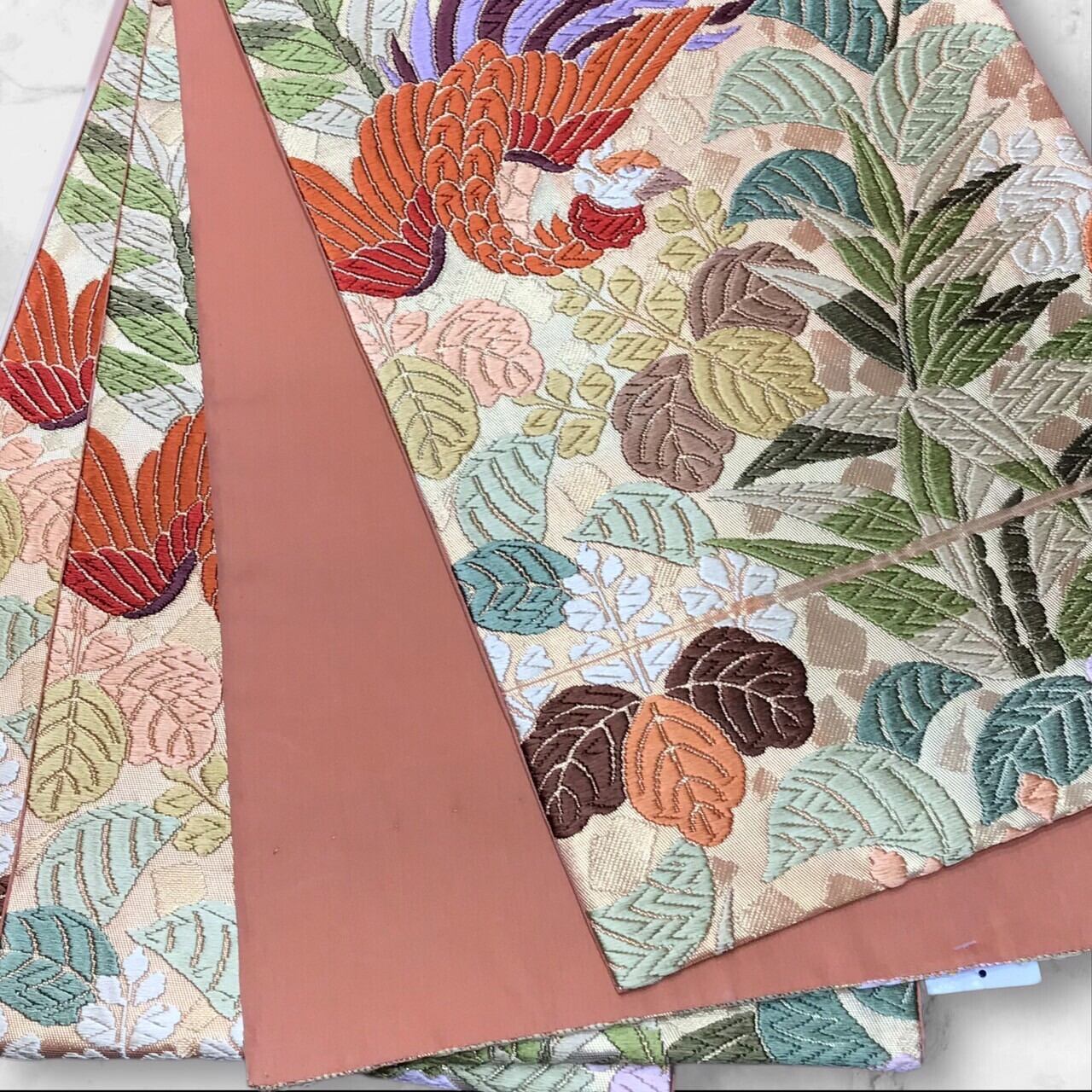 格式高い場にふさわしい、上品な華やかさが魅力のこの袋帯は、金地に美しい鳳凰と花葉文様を豪華に表現しています。伝統的な唐織技法を用いており、高い技術と繊細なデザインが融合し、他にはない華やかさを演出します。正絹素材がもたらす柔らかな肌触りも、着る方に特別な心地よさを提供します。