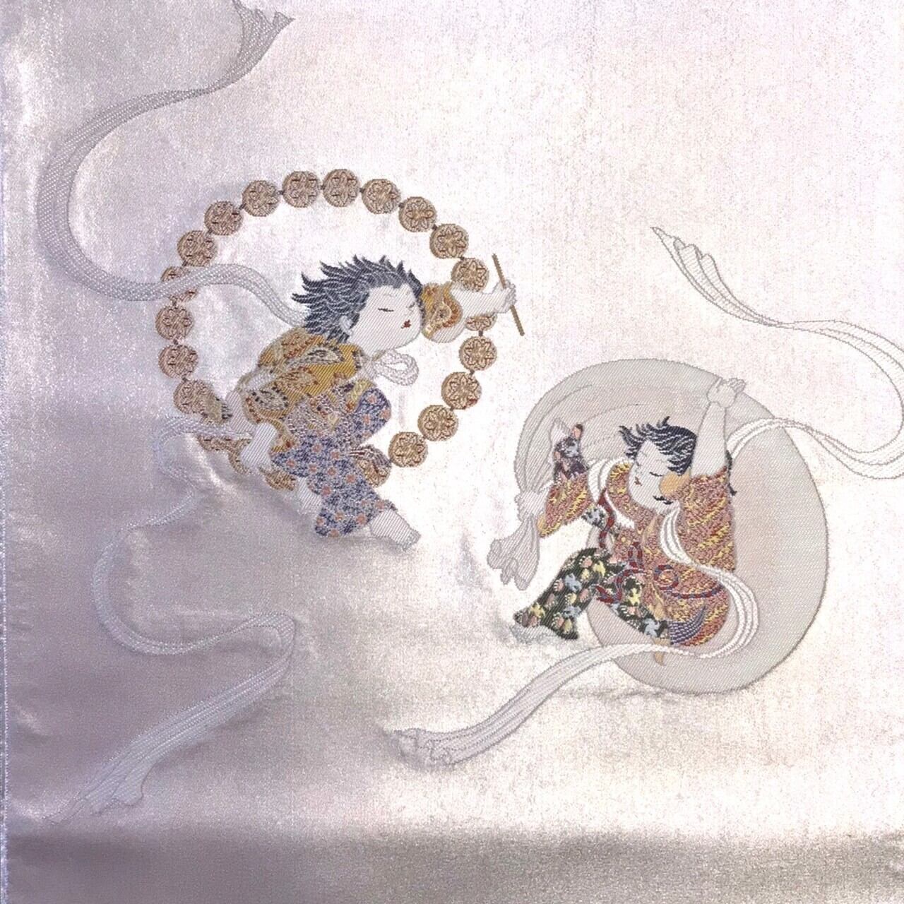 【逸品】加賀友禅 初代由水十久監修 ながしま織物 瀞銀錦 袋帯 うなゐ帯 題目「風神雷神」
