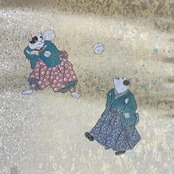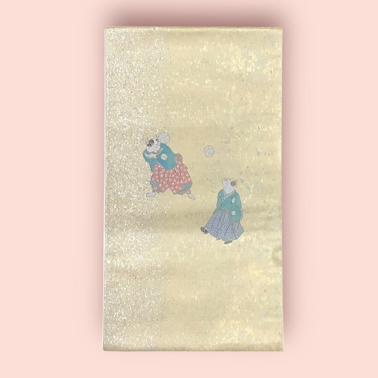 リユースの袋帯に絵を足す事で、新たな手描き帯としました。