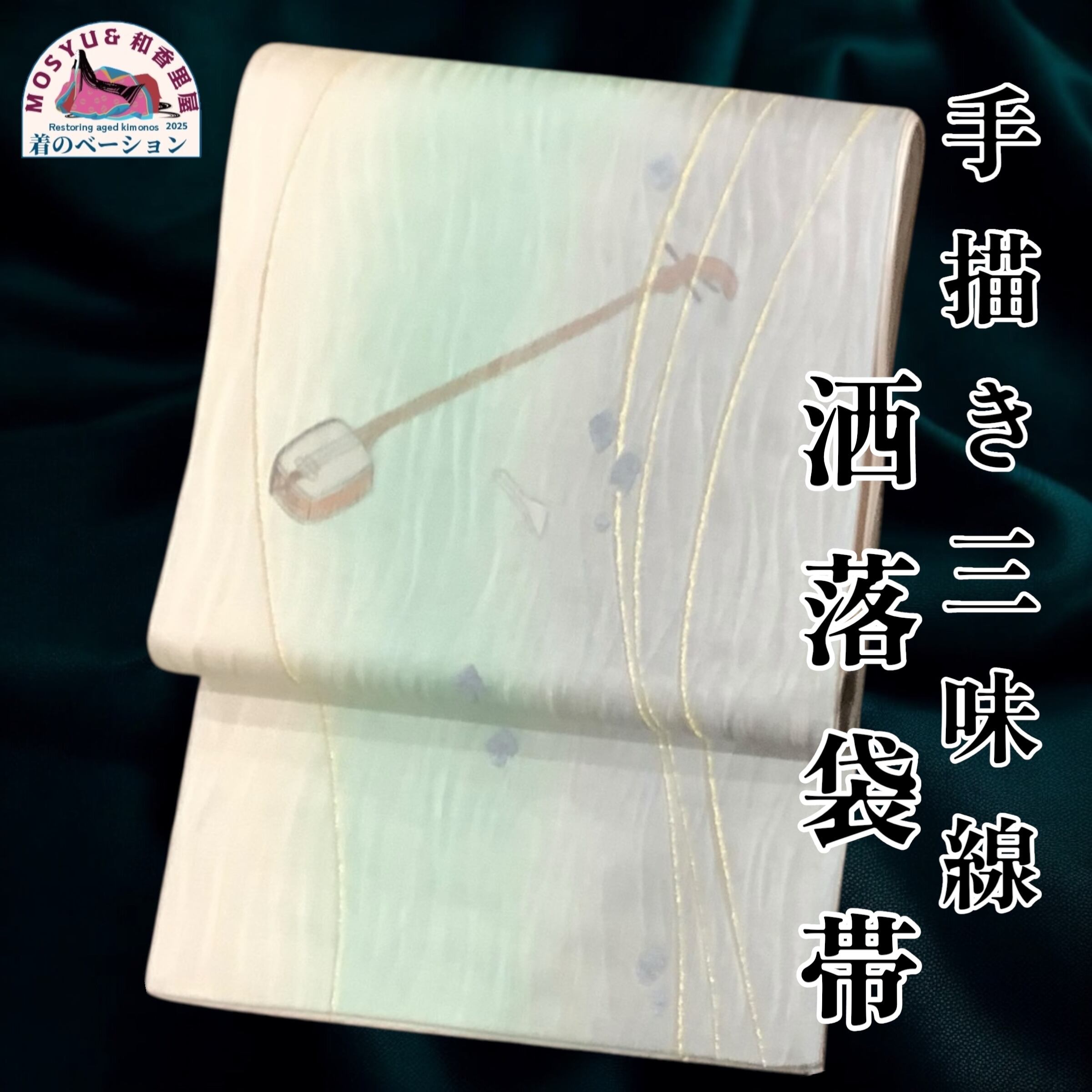 リユースの袋帯に絵を足す事で、新たな手描き帯としました。