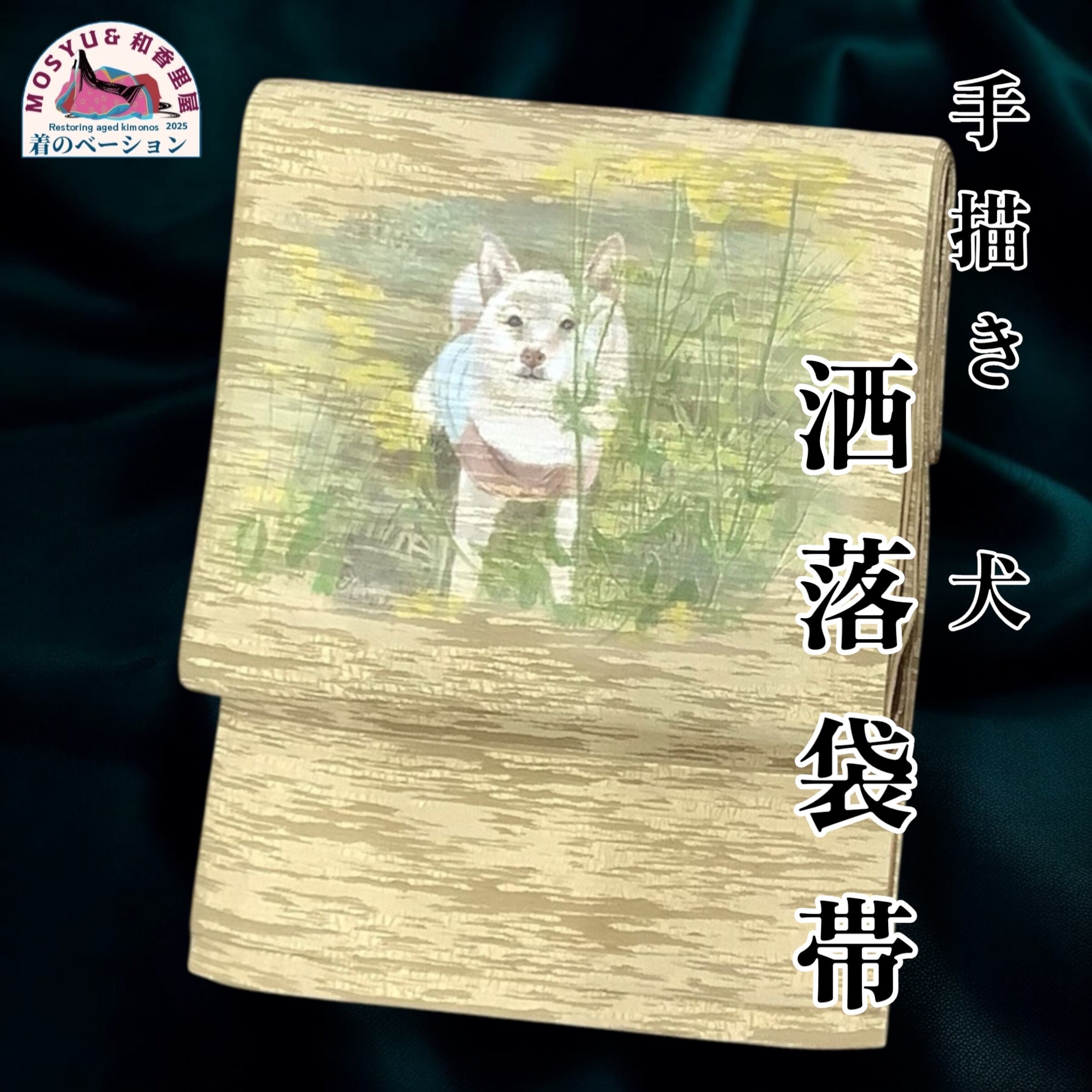 リユースの袋帯に絵を足す事で、新たな手描き帯としました。