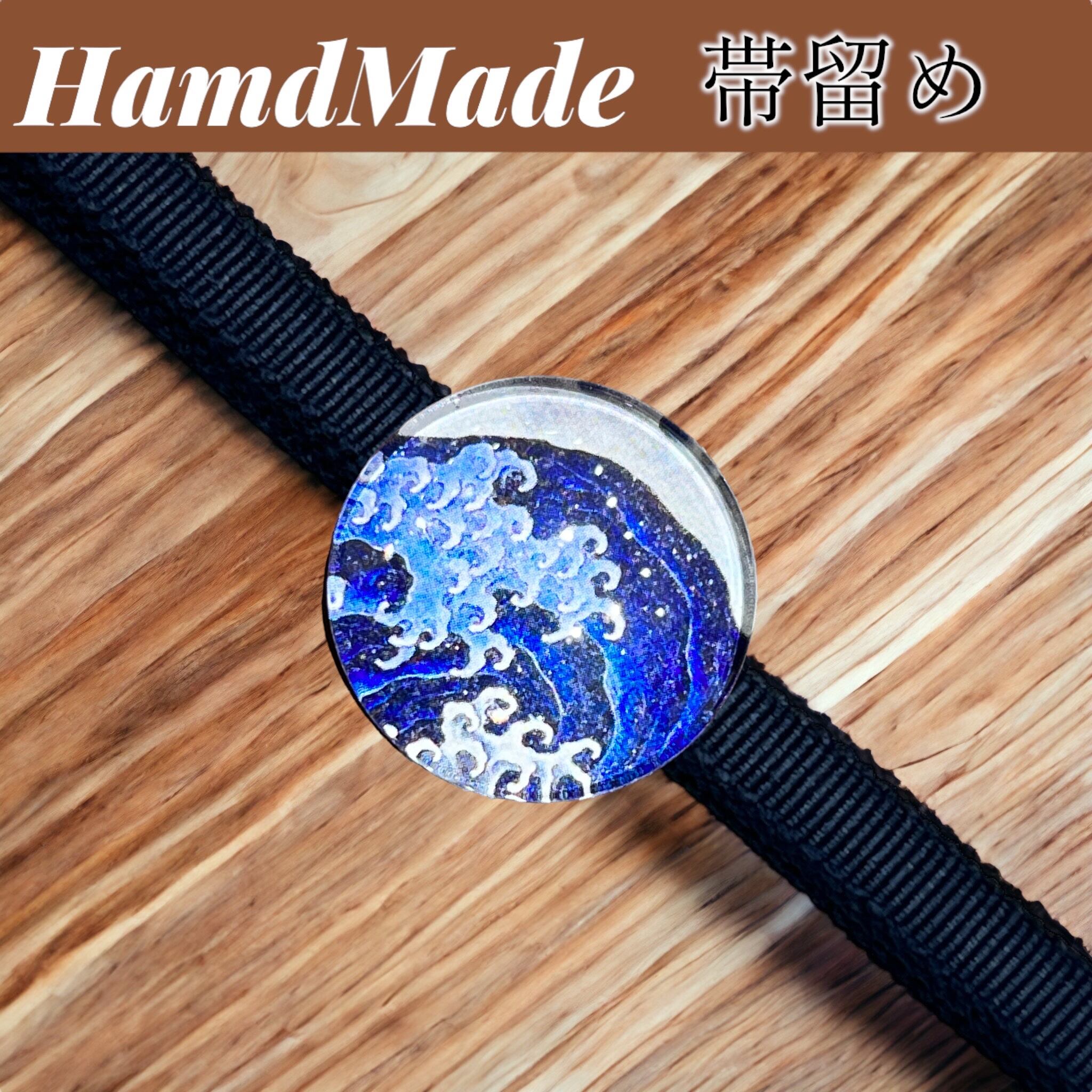 【Hand Made】丸型 帯留め 葛飾北斎 怒涛図 『女浪図』